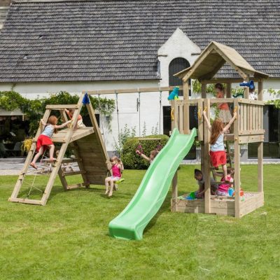 Climbing features like rock/climbing wall, ramp, nets, fireman’s poles, ladders, slides and monkey bars are the most popular. You can choose colourful accessories for a fun and inspiring space or keep it blending in with the garden with most accessories in green. For the swings, you can have seats of different kinds, flat seats are for children 3 and up and if you have a toddler or babies, under 36 months, then you will need a baby seat. One of the most sought-after swings are the group seats, like nest swings, that can be used from toddlers to 12. On a swing module you can also hang ring trapezes, ladders, tyre swings, knotted ropes, etc.