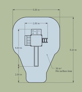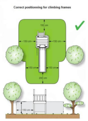 How much? 2m around it is the rule of thumb, but a minimum of 1.5m around a climbing frame and always 2m in front of slides. For swings, 3.5m normally front and back from where the swings hang from.