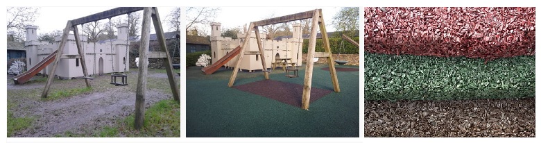 Rubber chippings have many benefits over wood chip: they are fire retardant, no chocking hazard, come in different fun and natural colours, without toxic paints, no need to top up and only 50 mm depth needed in most cases. Does need maintenance raking the surface regularly to make sure the rubber is evenly spread.