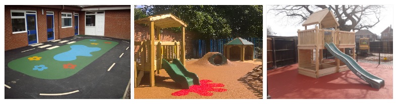 The material we use is a top of the range, dual layer porous system (SBR base and EPDM rubber top layer). It has a continuous finish that can be installed to flat, mounded or ramped sub-structures. It can have vibrant colours or black and detail graphics can be added to them to make the surface more interesting. This surface needs a specific base such as concrete, tarmac or MOT1 with pcc or timber edging. It is ideal for nurseries as it doesn’t rub off on clothes and the colour is long lasting. We can also supply the materials only.