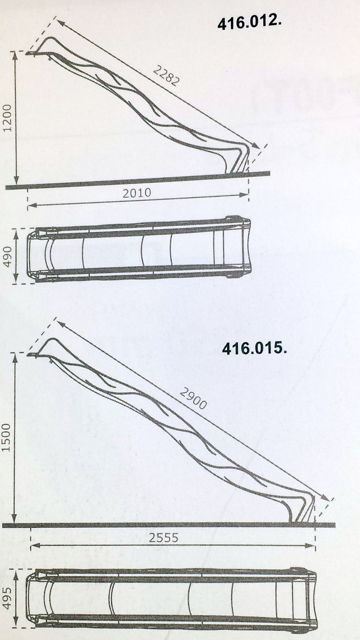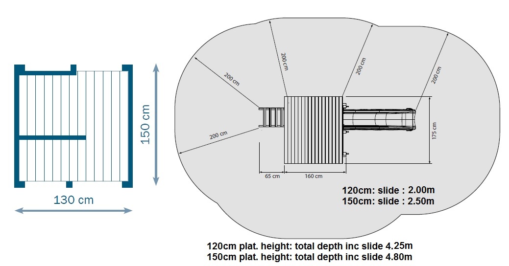 The 120cm platform height will take a 2.2m long slide, and the 150cm platform height will take a 2.9m long slide.